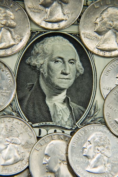 George Washington's face surrounded by quarters on U.S. dollar bill