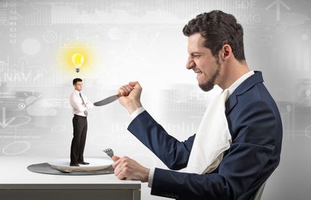 Giant businessman eating small man with financial background