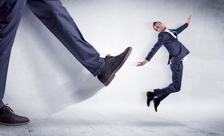 Giant leg kicking small businessman and he is flying away