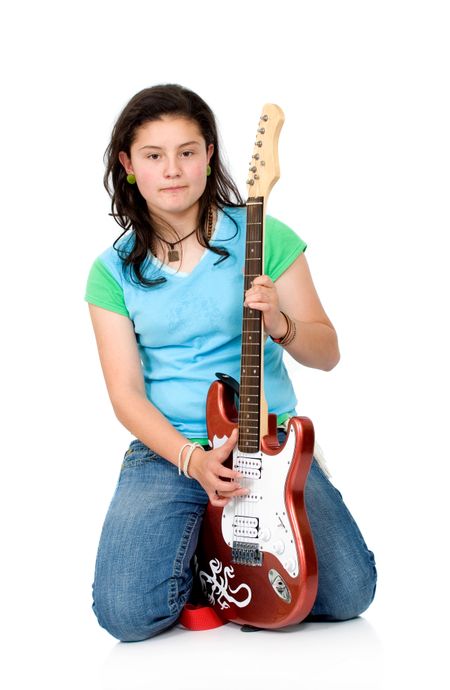 girl with aan electric guitar isolated over a white background