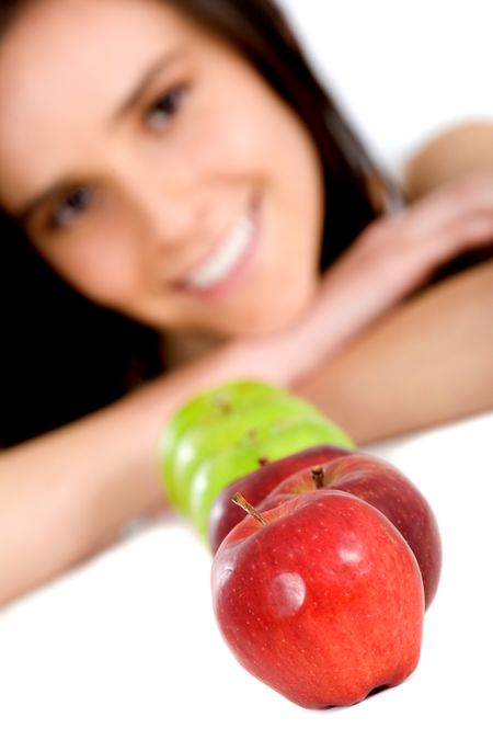 girl with apples in front of her - isolated over a white background