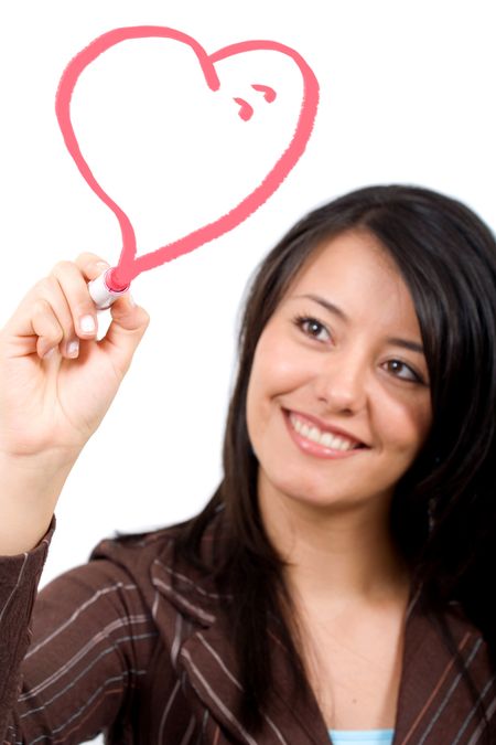 girl drawing a heart shape with ehr lipstick on screen isolated over a white background