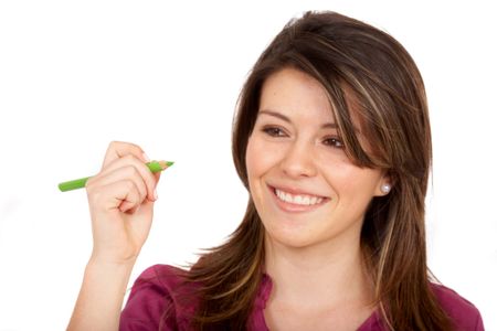 girl drawing on screen isolated over a white background - focus is on the pencil