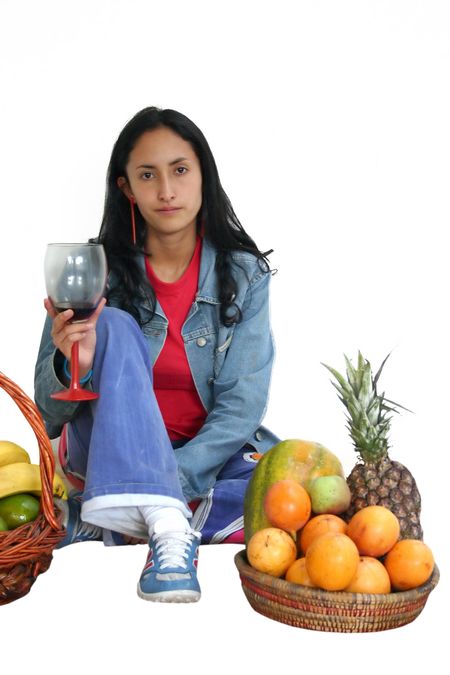 girl drinking with fruits around her
