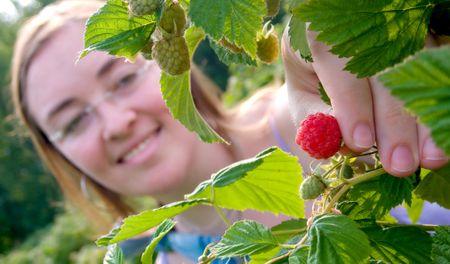 girl out in the field doing strawberry picking