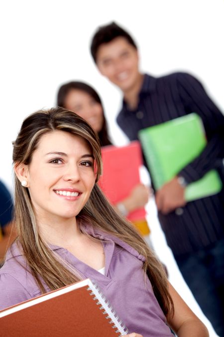 Girl with a group of students isolated over a white background