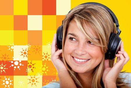 Girl with headphones listening to music over a yellow background