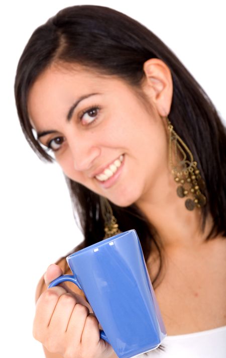 girl with a healthy drink isolated over a white background - focus is on the blue mug