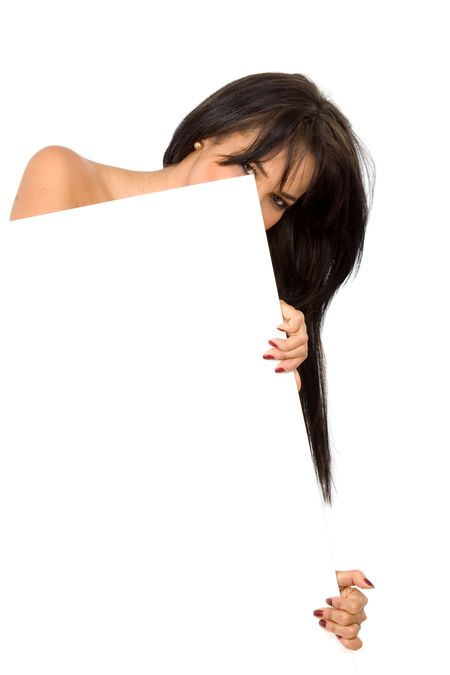 girl hiding behind a billboard isolated over a white background