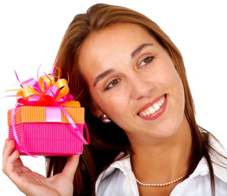 girl holding a gift and smiling - isolated over a white background