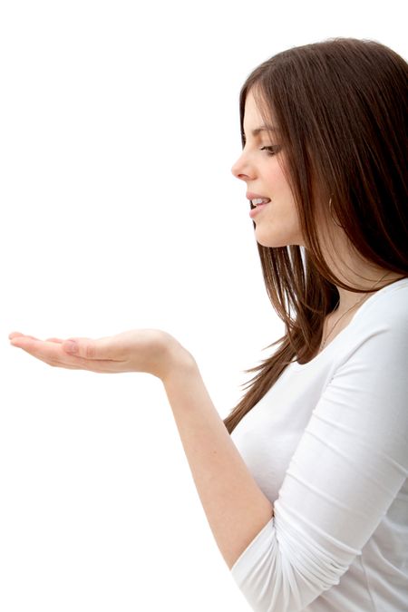 Girl holding something with her hand isolated on white