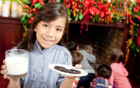 Girl holding milk and cookies for Santa Claus at Christmas day