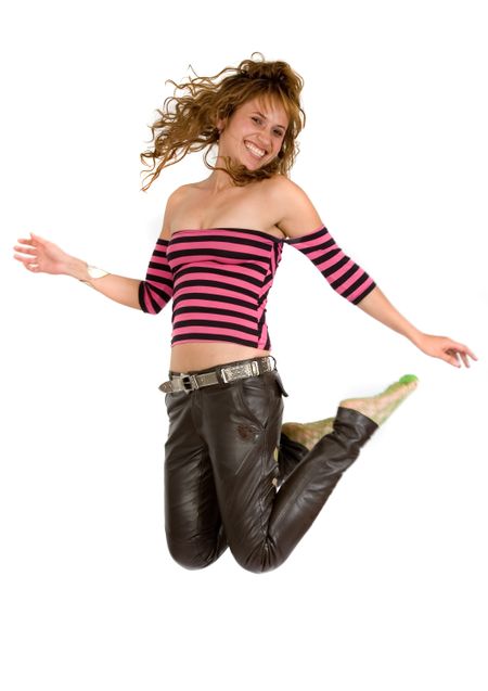 girl jumping full of joy over a white background