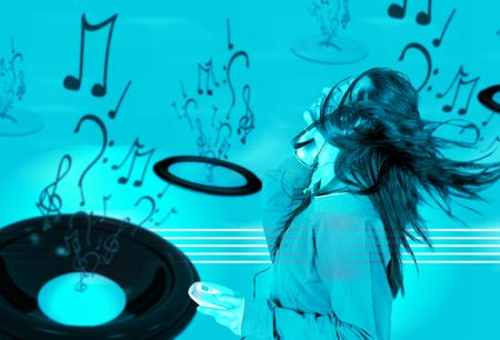 girl listening to music over a cyan musical background