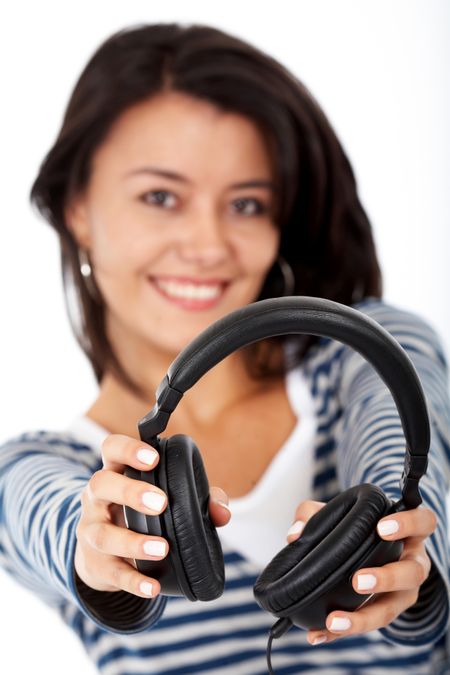 girl listening to music looking happy over white