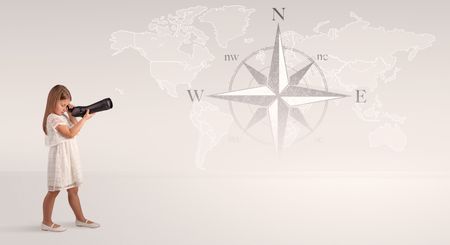 Little girl looking through spyglass to map and compass concept
