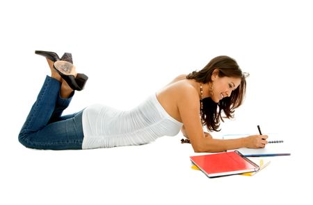 Girl lying on the floor studying isolated over a white background