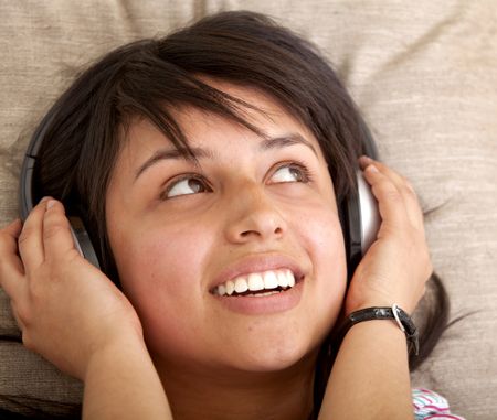 Girl lying her head on a cushion with earphones