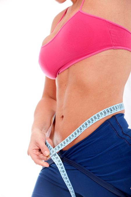 Girl measuring her waist checking if she has had any weight loss - isolated over a white background
