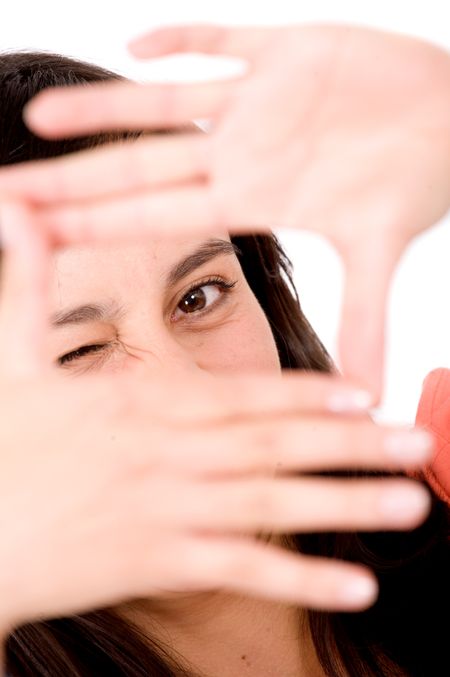 girl peeping through her hand frame isolated over a white background