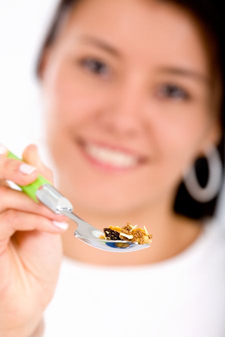 girl smiling while eating healthy cereal - shallow depth of field with focus on the cereal