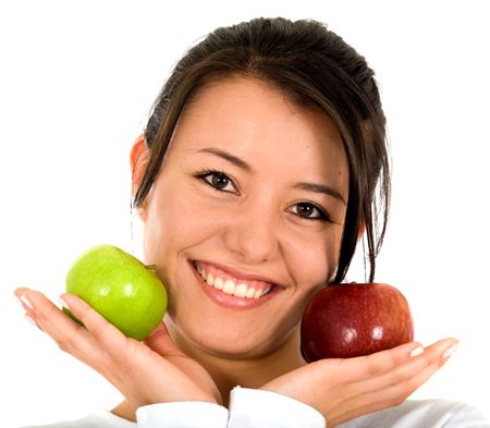 girl smiling while holding apples - isolated over a white background