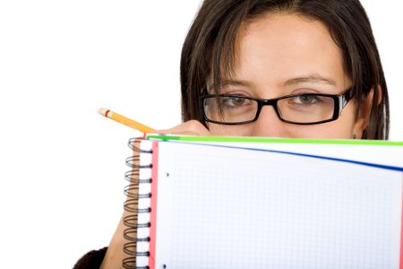 girl who is a student writing on a note pad and wearing glasses isolated over a white background