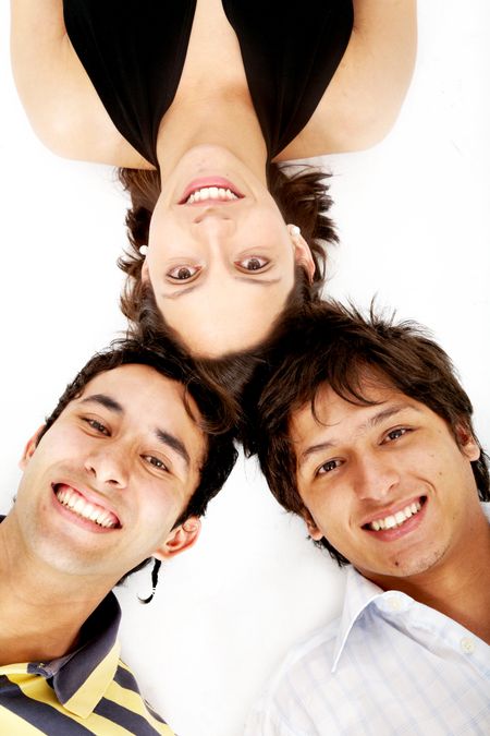 girl and two men smiling on the floor looking happy isolated over a white background