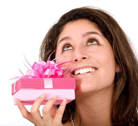 girl wishing for a good gift smiling over a white background