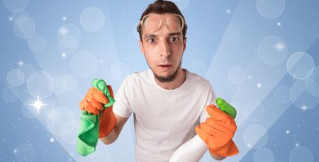 Glittered blue background with male housekeeper and cleaning equipment