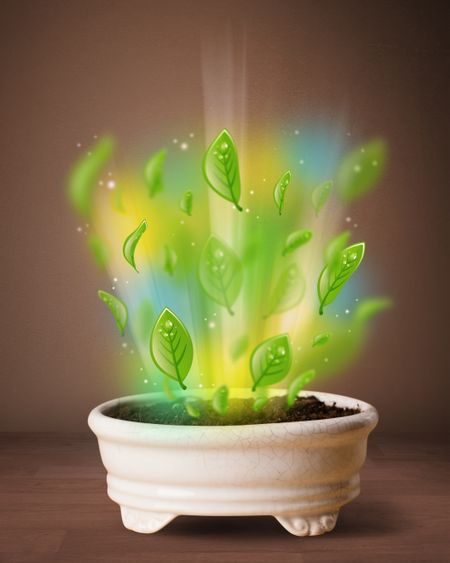 Glowing green leaves coming out of flowerpot