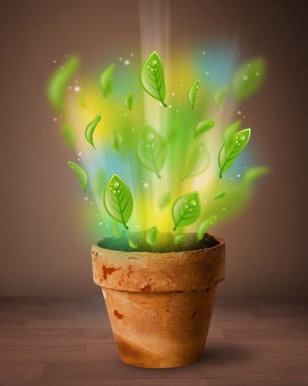 Glowing green leaves coming out of flowerpot