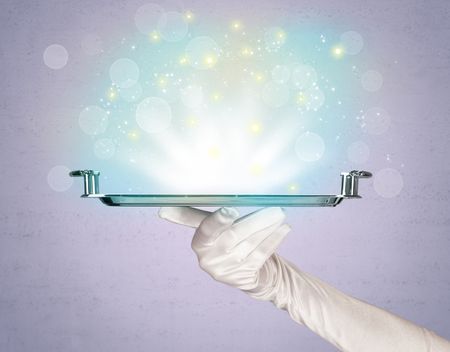 Glowing lights glitter on silver plate served on tray by waiter hand in white elegant glove in front of purple background