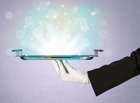 Glowing lights glitter on silver plate served on tray by waiter hand in white elegant glove in front of purple background