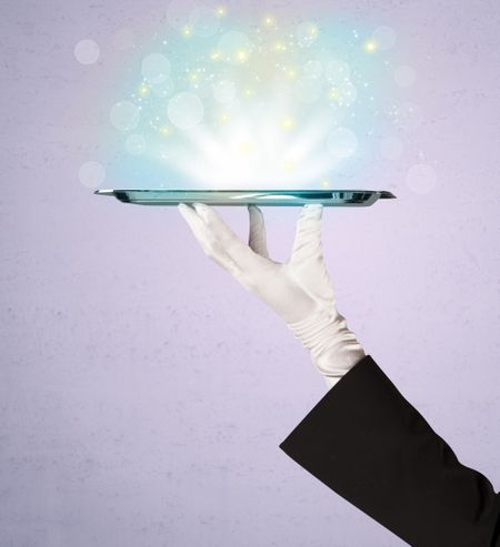 Glowing lights glitter on silver plate served on tray by waiter hand in white elegant glove in front of purple background