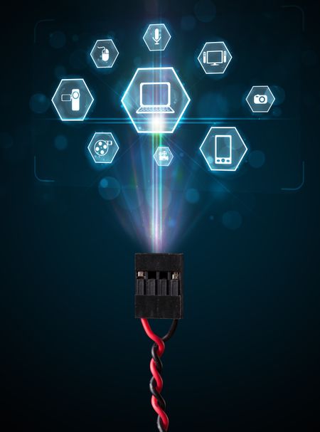 Glowing multimedia icons coming out of electric cable