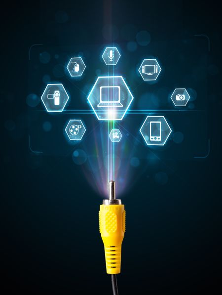 Glowing multimedia icons coming out of electric cable