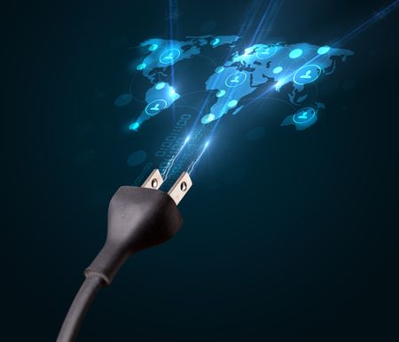 Glowing social network icons on world map coming out of electric cable