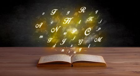 Glowing yellow alphabet letters coming out of an open book