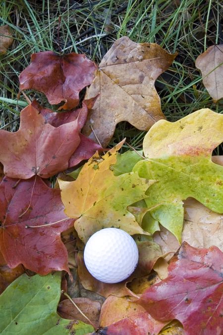 Golf ball among maple leaves in the rough