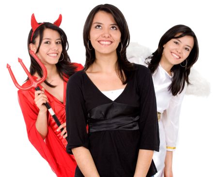 good or evil girl over a white background with an angel on one side and a devil on the other