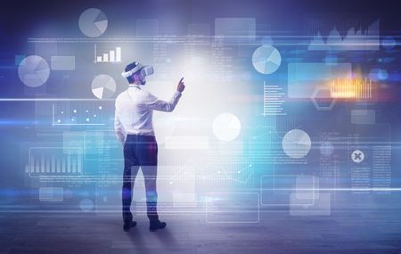 Good looking businessman checking reports and charts with vr glasses