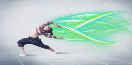 A good looking fresh street dancer dancing in front of grey background with white and bright, colorful green lines concept