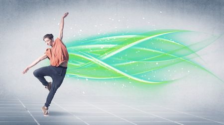 A good looking fresh street dancer dancing in front of grey background with white and bright, colorful green lines concept