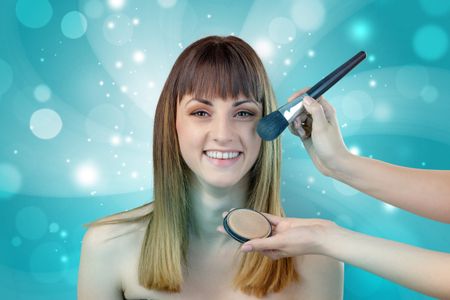 Graceful brunette woman getting ready with shiny turquoise wallpaper