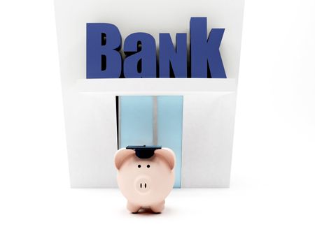 Graduated piggybank waiting to enter the bank isolated over a white background