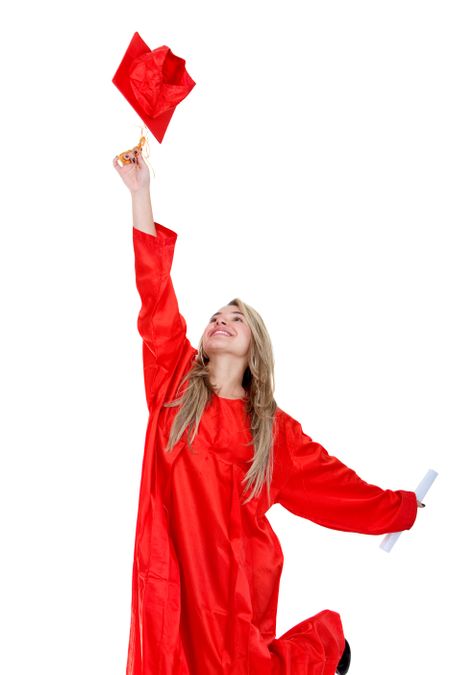 Graduation student jumping isolated over a white background