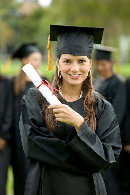 graduation woman portrait smiling and looking happy outdoors