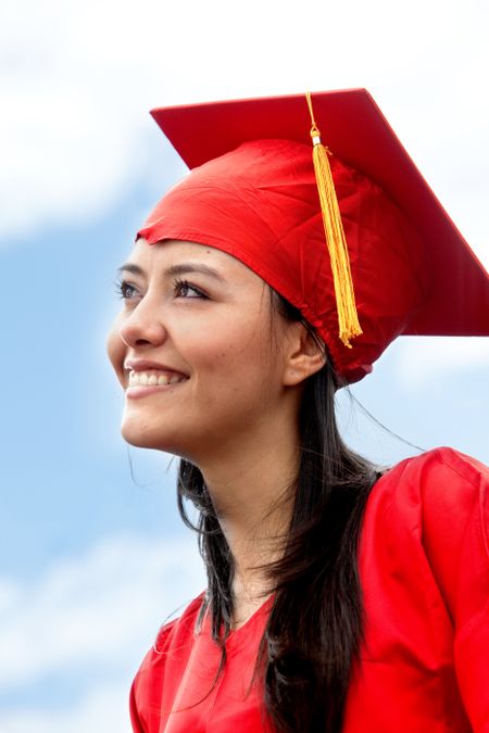 graduation woman portrait smiling and looking happy outdoors