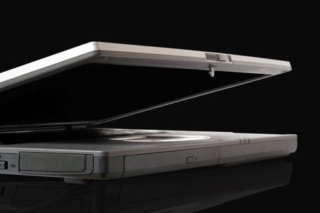 gray laptop over a black background